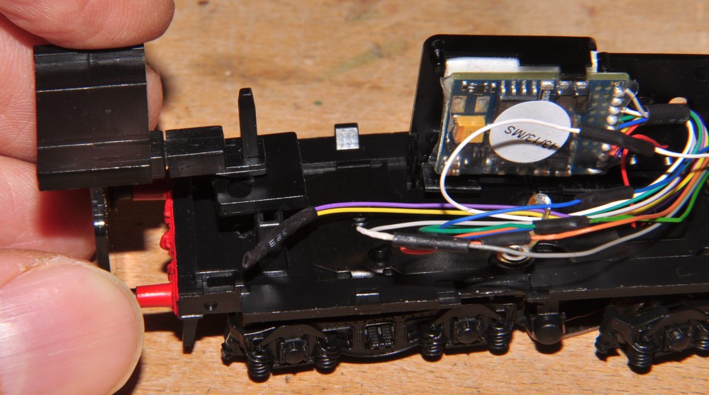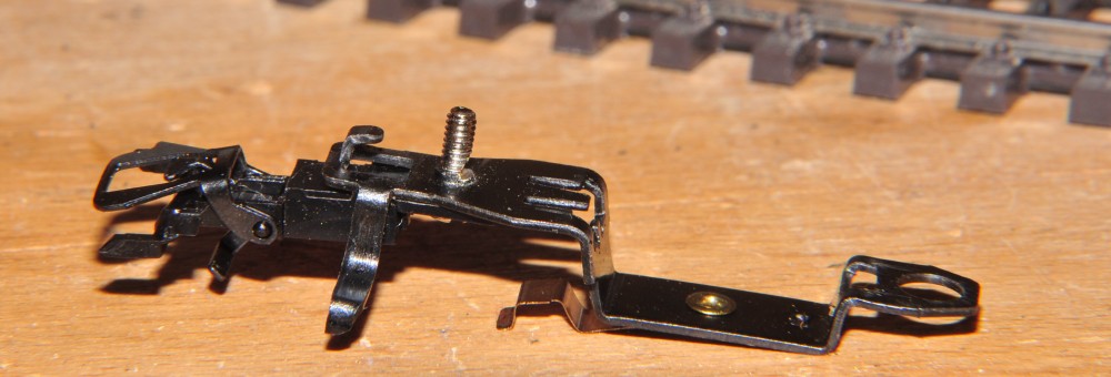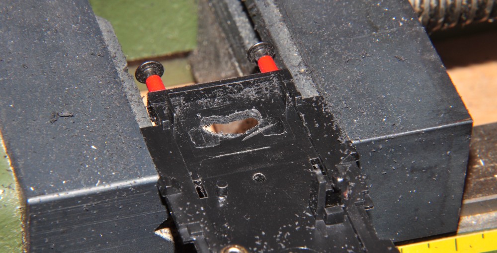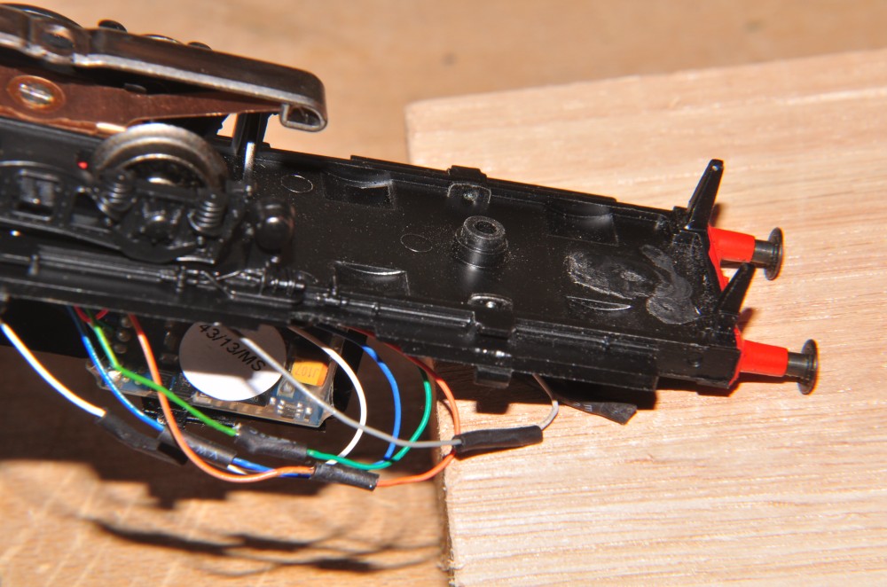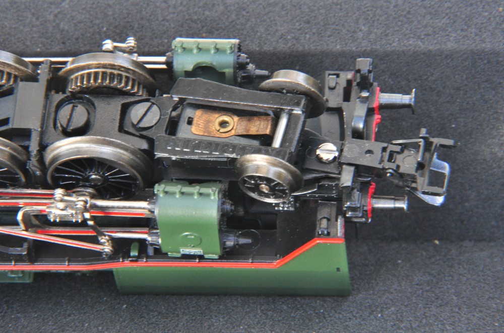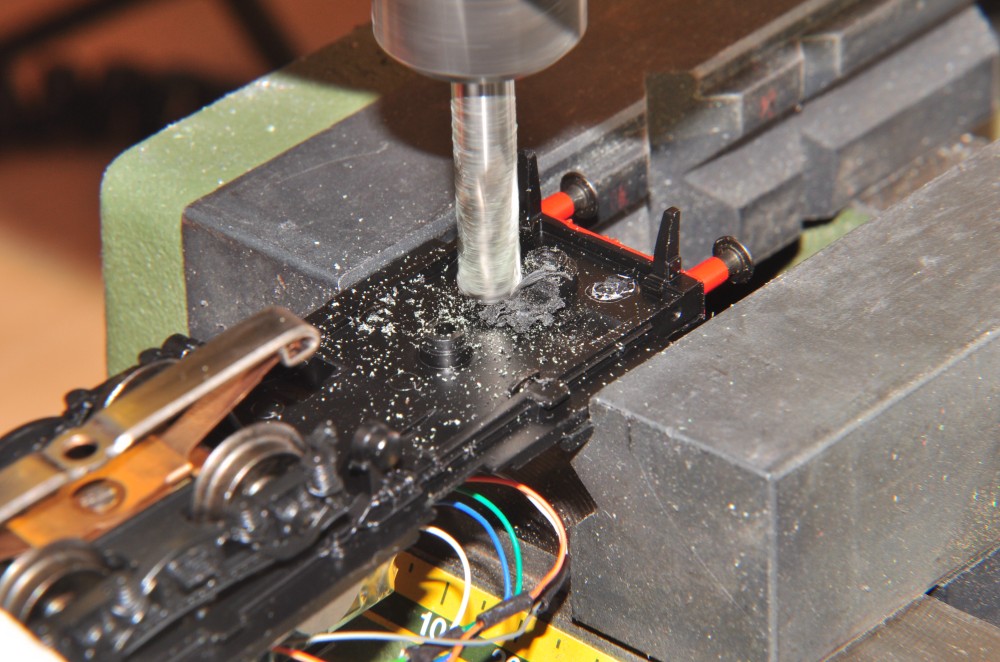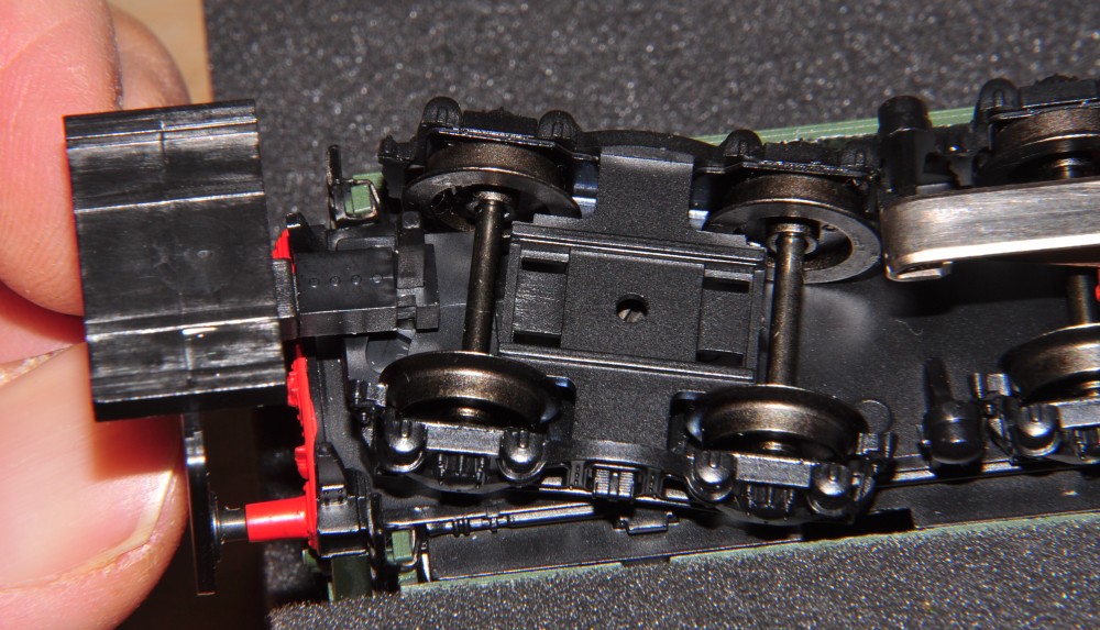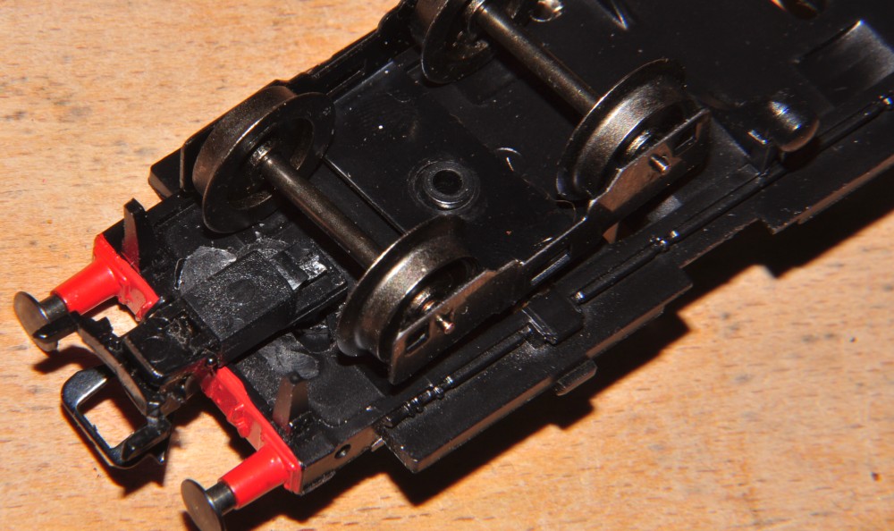 Sowohl der Befestigungspunkt als auch die Schwenkbegrenzung wurde entfernt. Wollte man die Kulisse in den Wagenboden einlassen, müsste etwas mehr Mühe aufgewendet werden. Dann wäre exaktes Anfertigen eines Ausschnittes notwendig. Dies kann man sich bei der SNCB-Lok ersparen. |