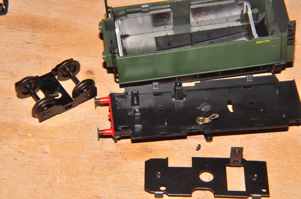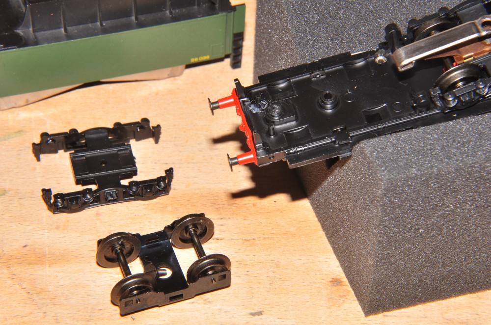 Zum Einebnen des Tenderbodens muss das Modell komplett zerlegt werden. Die Drehgestellblenden sind außen geklipst und werden als erstes entfernt. Dann sind die Schrauben zugänglich, mit denen die Drehgestelle (Stuhlbleche) befestigt sind. Der Schleifer kann am Rahmen montiert bleiben und wird komplett mit der Drehgestellblende abgenommen. Das Blech ganz unten auf dem Foto könnte als Kontaktblech dienen. An 4 Punkten stellt es automatisch eine Masseverbindung her, die man nutzen könnte. |