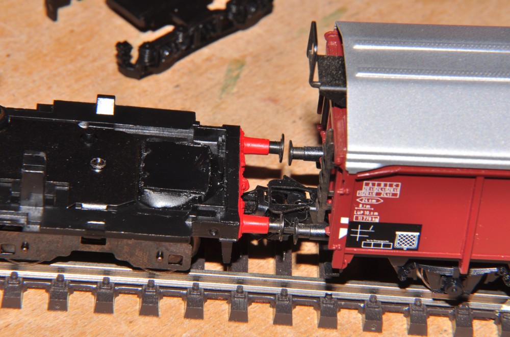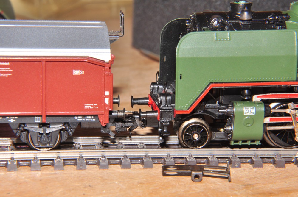 Bereits ohne ein neues Loch zu bohren wird der Kuppelabstand erheblich reduziert. Insgesamt ist der Umbau eine schöne Basteltätgkeit mit geringem Schwierigkeitsgrad, wenn man einmal vom Einebnen des Tenderbodens absieht. Aber das Ergebnis spricht für sich. |