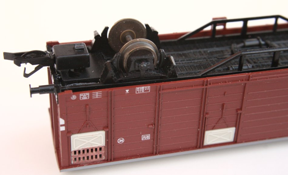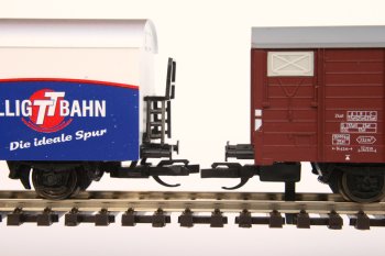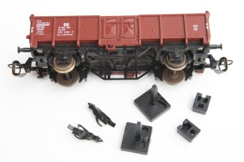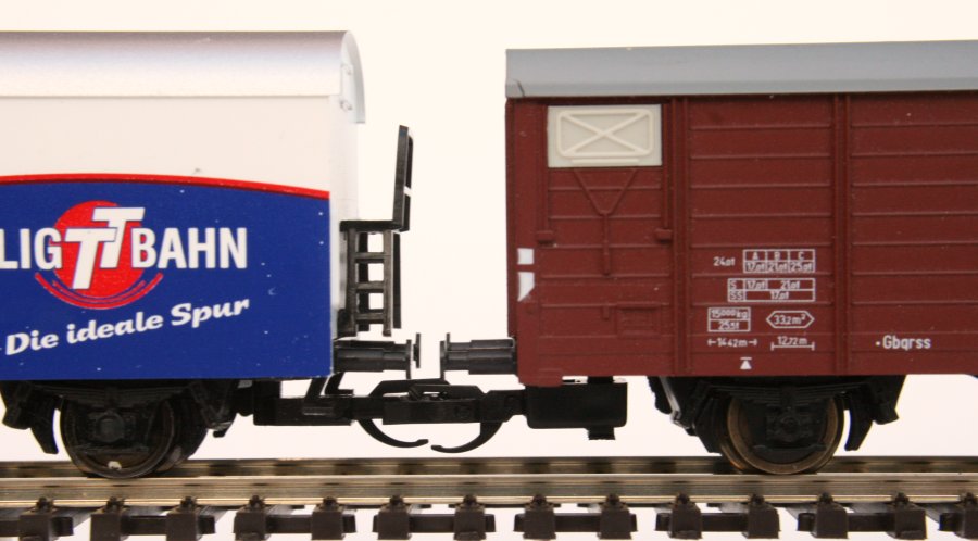 Mit unserer Kulisse 111 und den Schächten 109 ist dieser Umbau nun möglich. Ergänzend benötigt man die Tillig-Kupplungsköpfe 210810. Den Umbau eines Wagens zeigen wir auf dieser Seite. |