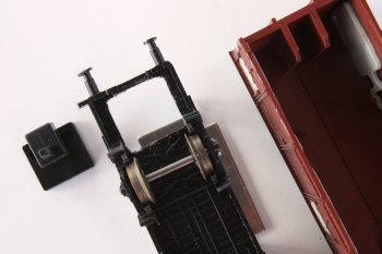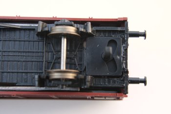 In den meisten Fällen wird eine komplette Zerlegung notwendig sein, um die alte Kupplung mitsamt Rückstellfeder demontieren zu können. Außerdem muss die Kulissenführung oft in den Wagenboden eingelassen werden. Dazu wird einfach ein Loch in den Wagenboden gesägt. Damit legt man gleichzeitig den Kuppelabstand fest. Das Maß von der vorderen Kante der 111 bis zu den Puffern beträgt 7,5mm. Wer es lieber enger mag, kann hier durchaus auch noch mehr zugeben. Dies sollte man auch von den Radien der eigenen Anlage abhängig machen. |