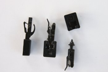 Zunächst beginnt man mit den Vorbereitungen an der Kupplung 210810: Der nach hinten herausragende Zapfen an diesen Köpfen wird abgetrennt. Links ist der unveränderte Kupplungskopf zu sehen; bei den beiden Köpfen rechts im Bild ist dies schon geschehen. Danach prüft man, ob der Kopf nun in den Schacht 109 passt.